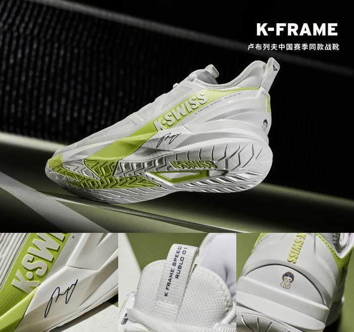 卢布列夫的 K-FRAME SPEED RUBLO 则以白配酸性绿条纹为特色,融入 RUBLO Logo、签名及卢布猫元素。