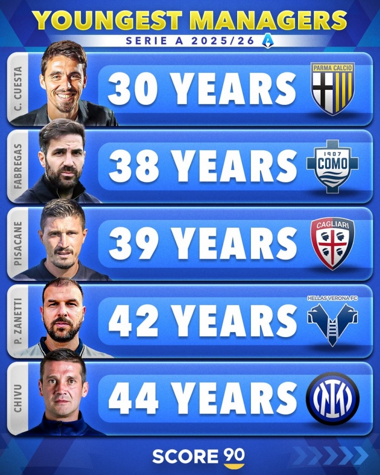 8月17日讯 Score90统计了五大联赛球队在任主帅的年龄,并按照不同的联赛列出最年轻主帅排名。